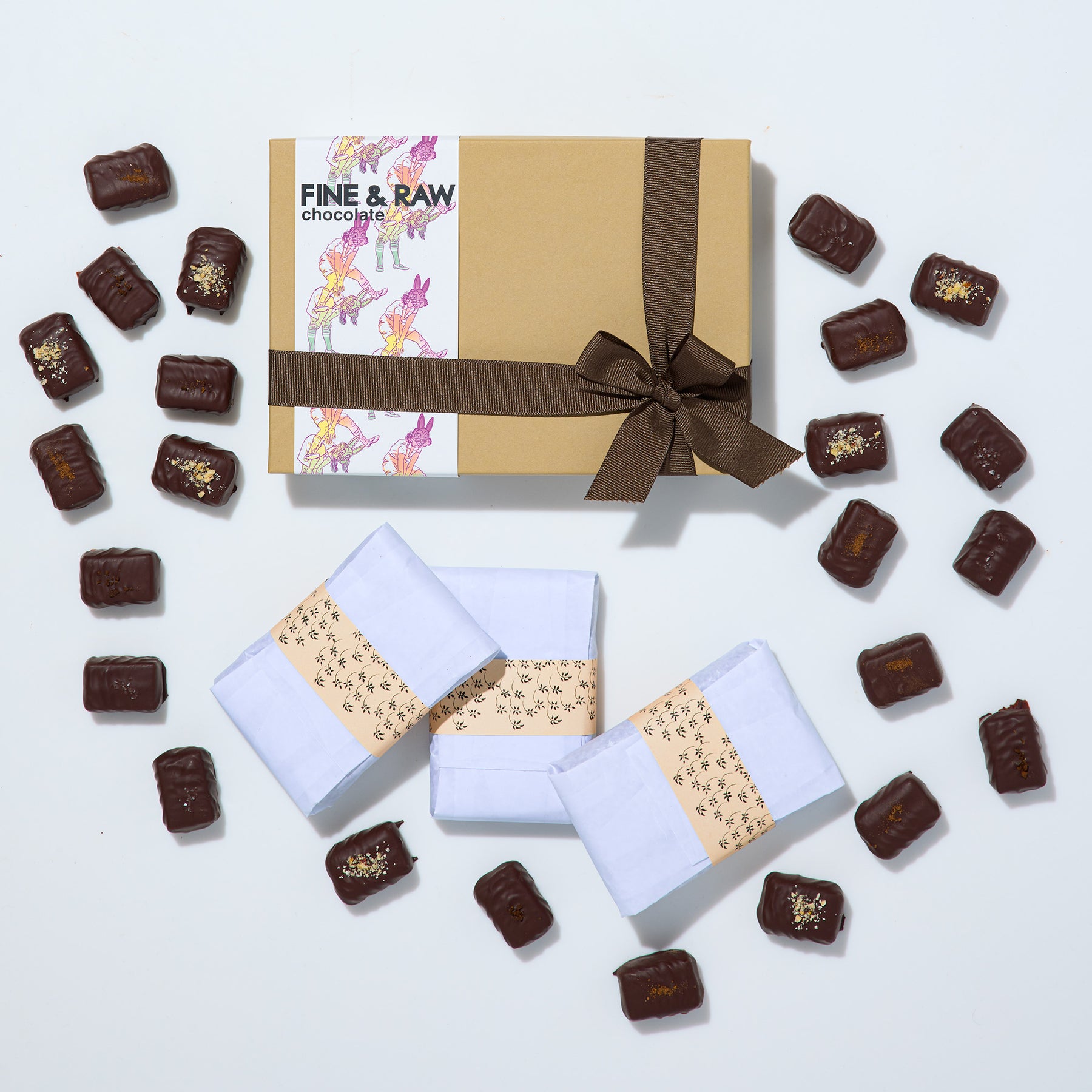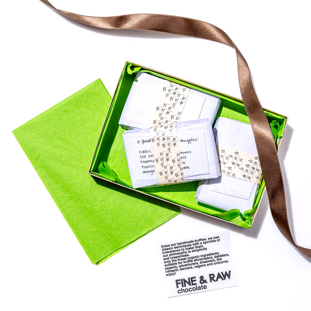 Ingredients (vary based on chocolatier’s selection) may include: organic cacao bean, organic cacao powder, organic cacao butter, organic coconut oil, organic coconut sugar, organic agave, organic olive oil, organic hazelnuts, organic orange extract, organic espresso bean, organic cinnamon, sea salt.